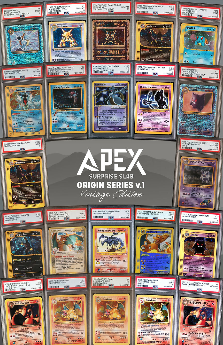 ​Every APEX surprise slab volume is comprised of graded Pokémon trading cards that were carefully curated, mixed, and formed into an opportunity for collectors to attain high-end grails at a fraction of market whilst still maintaining a desirable floor.